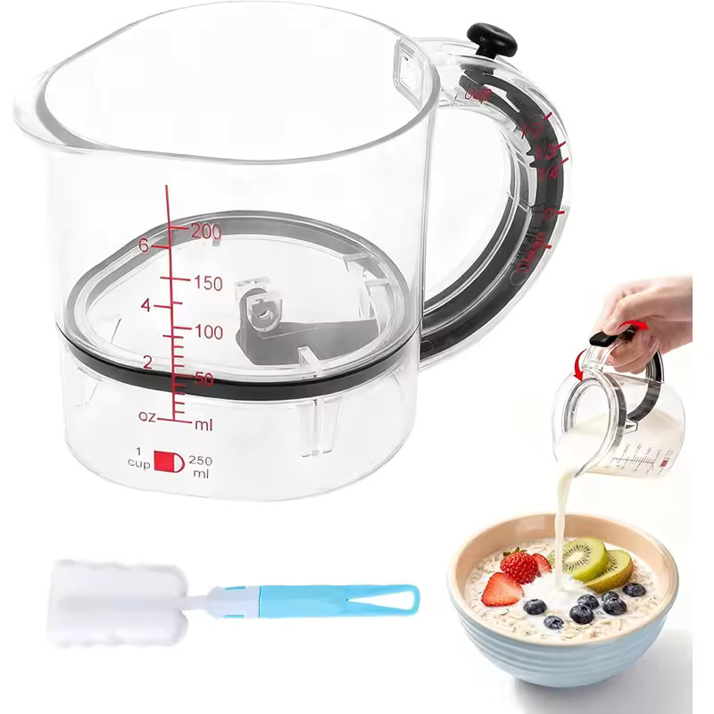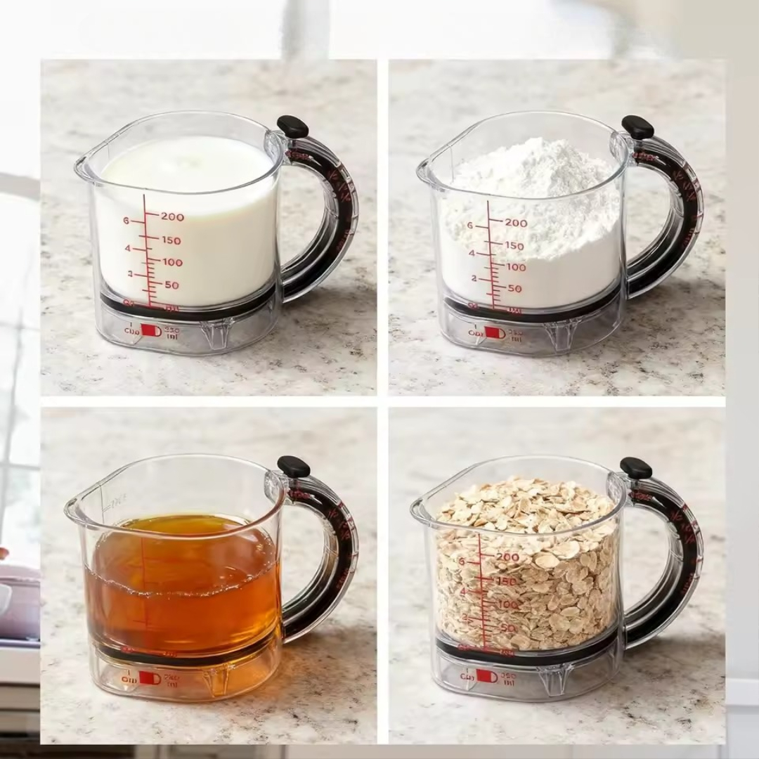 Dette 4-i-1 justerbare målebæger giver dig præcis og problemfri måling af både våde og tørre ingredienser – alt sammen i ét smart og pladsbesparende værktøj. Dette justerbare bæger erstatter et helt sæt målebægre, så du kan skifte mellem 250 ml, 125 ml, 83 ml og 62 ml med et enkelt skub. Den tætte, indbyggede forsegling tørrer klæbrige ingredienser af, mens du hælder, hvilket sparer tid og reducerer spild. Ideel til bagning, madlavning, tilberedning af måltider og endda tykke smørepålæg som honning eller jordnøddesmør.