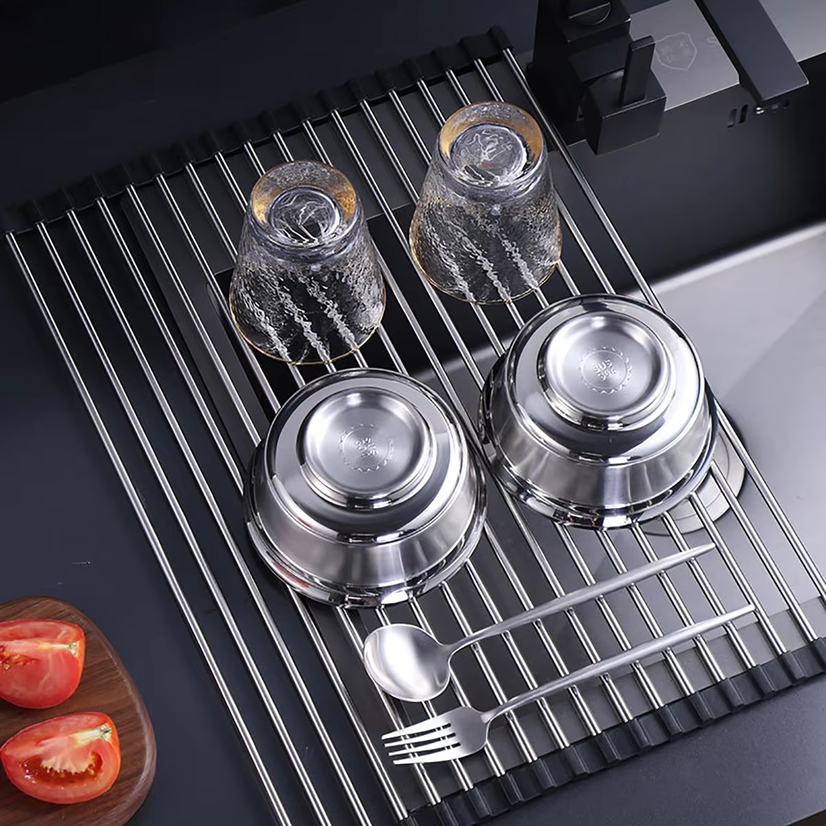 Dette afløbsstativ til vasken kan klappes sammen, når det ikke er i brug. Det fylder ikke meget, hvilket gør det perfekt til små køkkener. Du skal blot rulle det sammen og opbevare det i en skuffe, når du har brug for det.