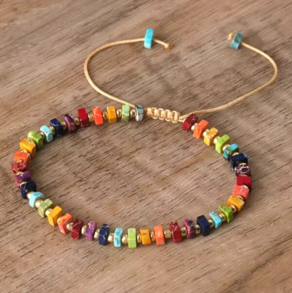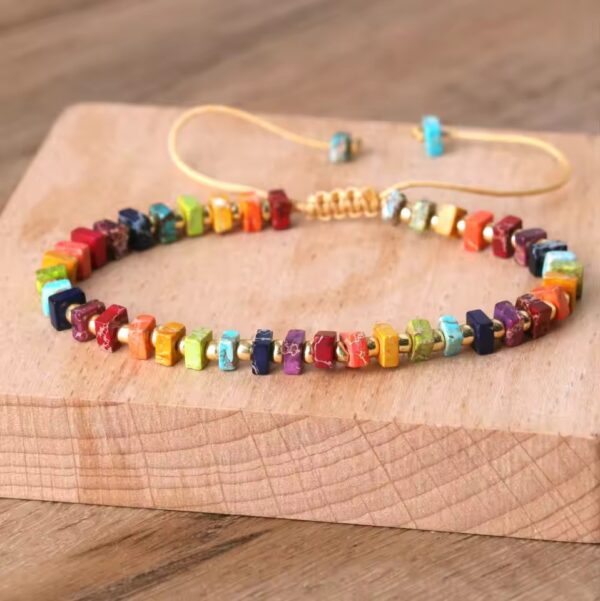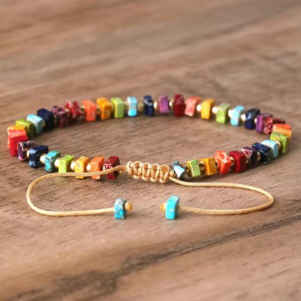 Armbåndet med chakra-sten har en smuk firkantet form lavet af naturlige kejserlige sten. Hvert armbånd er håndlavet, hvilket giver det en unik charme, der passer til ethvert outfit. Dets elegante design er perfekt til både afslappede og formelle lejligheder.