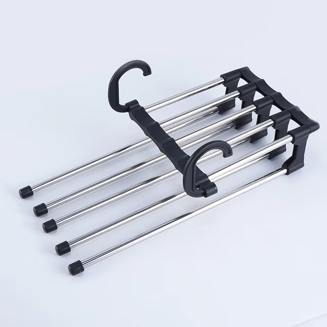 Buksestativet har et smart, pladsbesparende design, der giver dig mulighed for at organisere dine bukser pænt. Den udtrækkelige og sammenklappelige struktur hjælper dig med at maksimere pladsen i skabet ved at holde dine bukser i et kompakt og pænt arrangement.