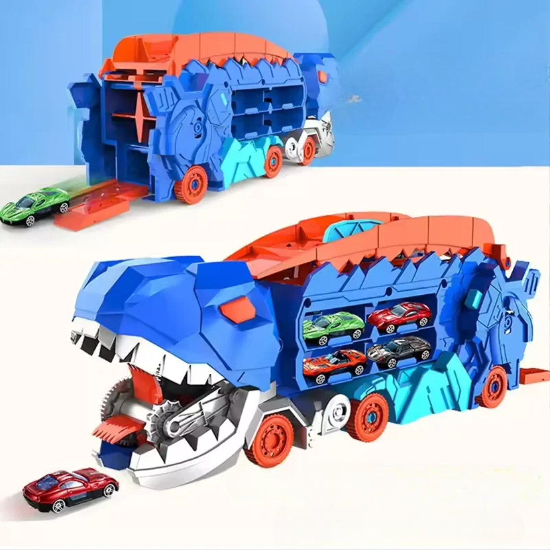 Denne dinosaur-transportbil giver børn en spændende legeoplevelse med flere måder at lege på – skub til den for at “sluge” biler, åbn den til en stående dinosaur, og kør om kap med biler på den dobbelte bane. Den kan også opbevare over 16 metalbiler, så legetøjet er organiseret og nemt at transportere. Et sjovt, fantasifuldt og interaktivt legetøj, der kombinerer dinosaurer, racerløb og opbevaring – alt i ét!
