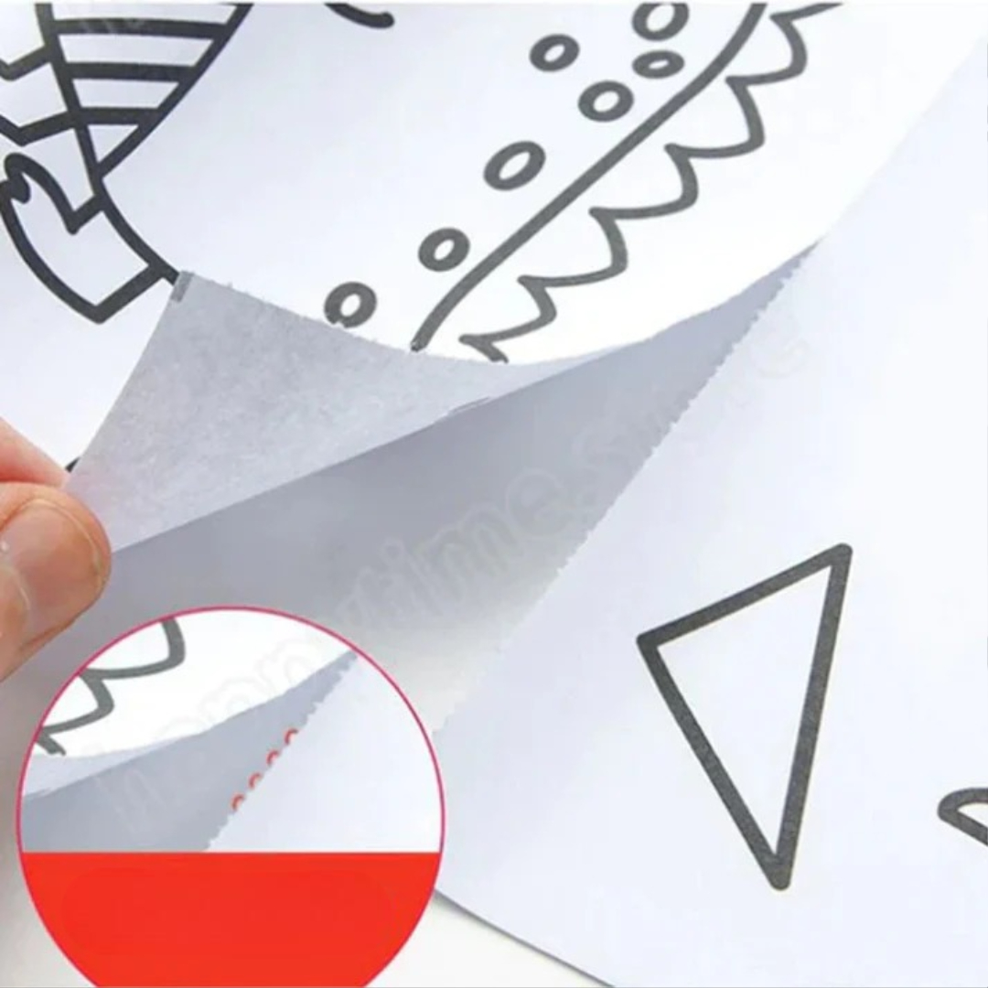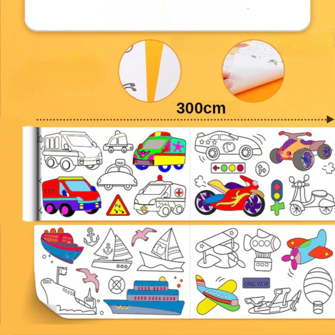 Denne farverulle forvandler vægge, gulve eller borde til kreative legezoner for børn. Bare sæt den fast, farvelæg, og lad fantasien få frit løb! Med sjove temaer som dinosaurer, dyr, transport eller prinsesser holder den de små beskæftiget i timevis – ingen gentagelser, ingen kedsomhed.