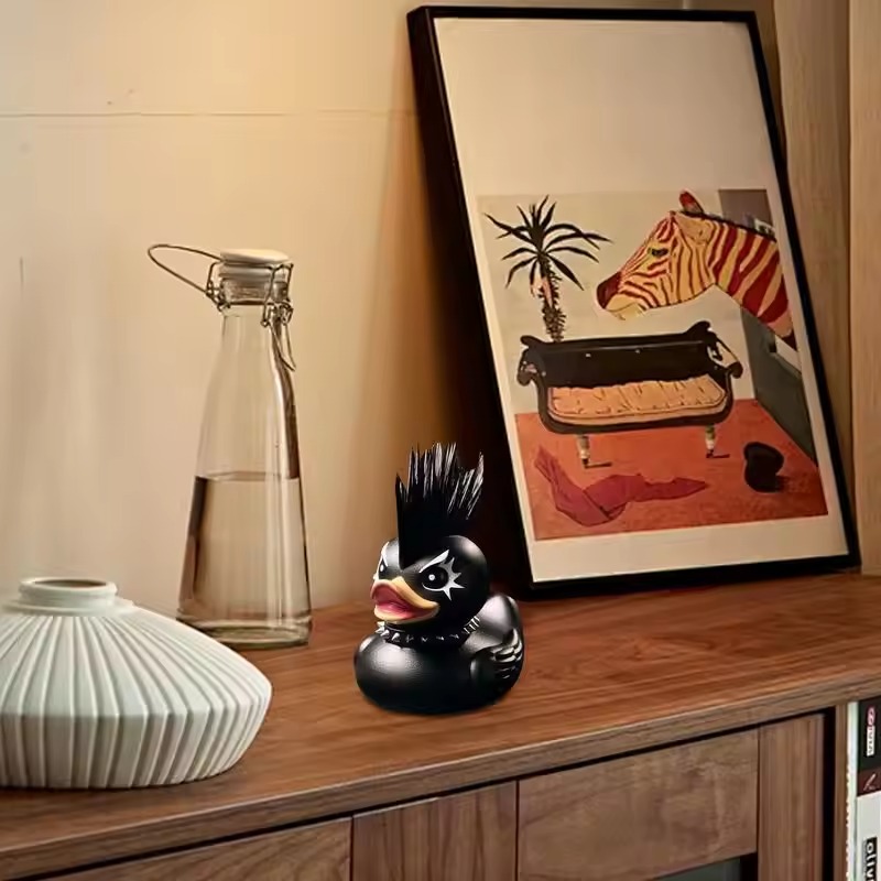 Andefiguren skiller sig ud med sit legende og dristige look. Den blander en rockinspireret stil med en sjov dyreform. Det gør den til et flot blikfang på enhver hylde eller ethvert skrivebord.
