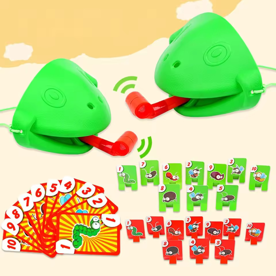 Frogtunge-maske-spillet forvandler spillerne til sultne frøer, der kæmper om at slå insekter ned med en sjov klæbrig tunge. Det er et tempofyldt, lattermildt spil, der opbygger hånd-øje-koordination, talgenkendelse, fokus og fantasi – perfekt til børn, familier og festspilelskere.