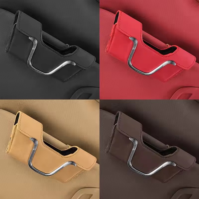 Bilbrilleholderen har et praktisk clip-on-design, der nemt kan fastgøres til bilens solskærm. Det sikrer hurtig adgang til dine solbriller, mens du kører. Den stærke klips holder holderen på plads og forhindrer, at den glider eller falder ned.