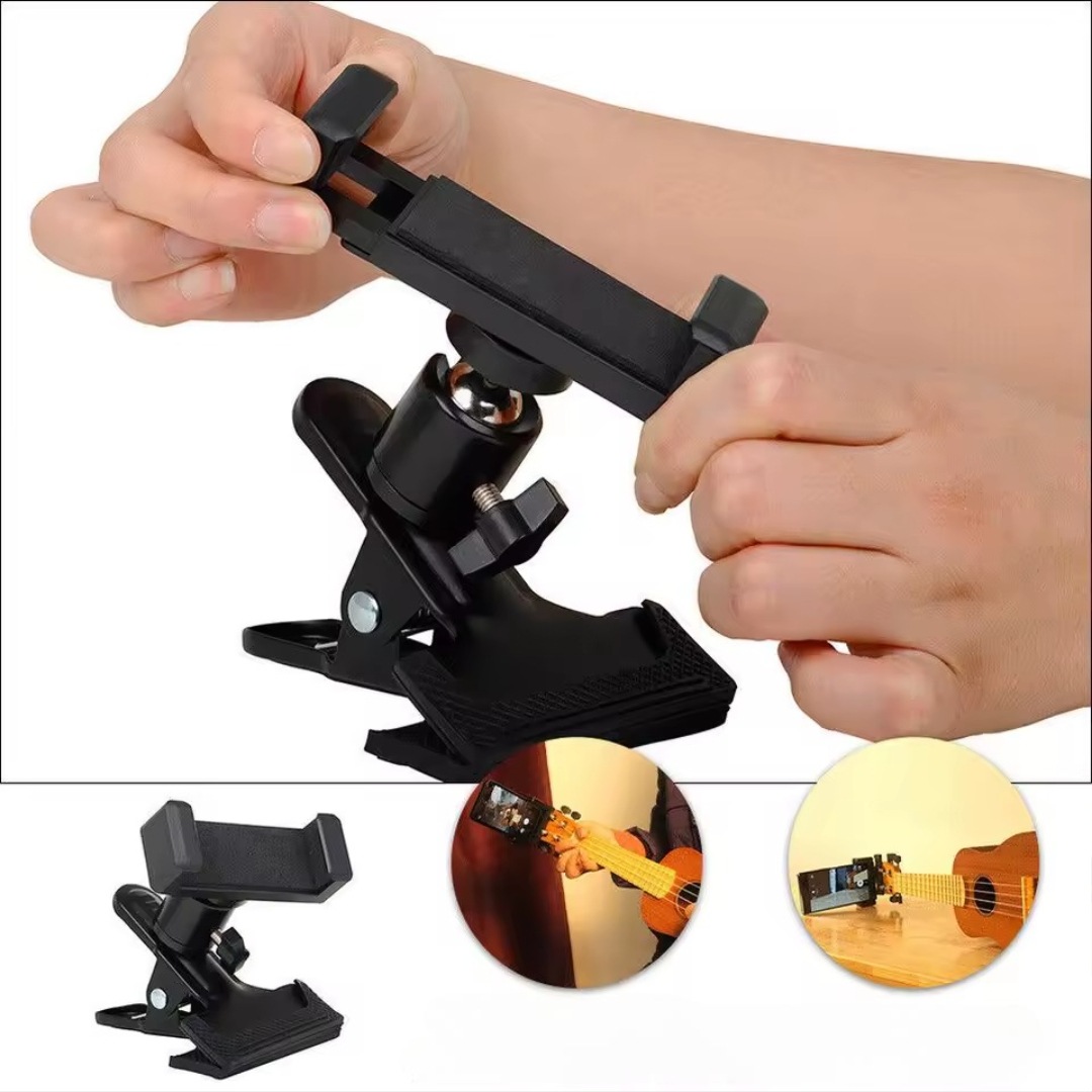Denne 360° justerbare guitartelefonholder giver dig en stabil måde at montere din guitar eller dit instrument på, samtidig med at din telefon holdes i den perfekte synsvinkel. Den er ideel til at optage videoer, livestreame, tage lektioner eller øve håndfrit.