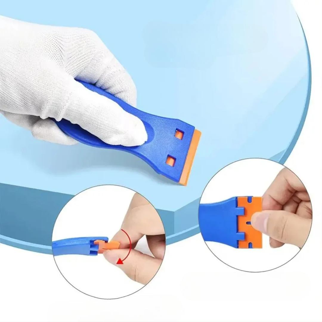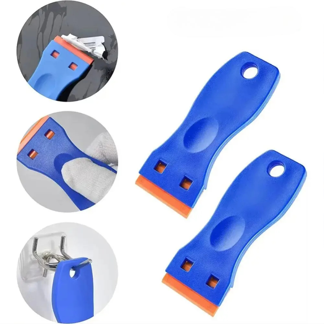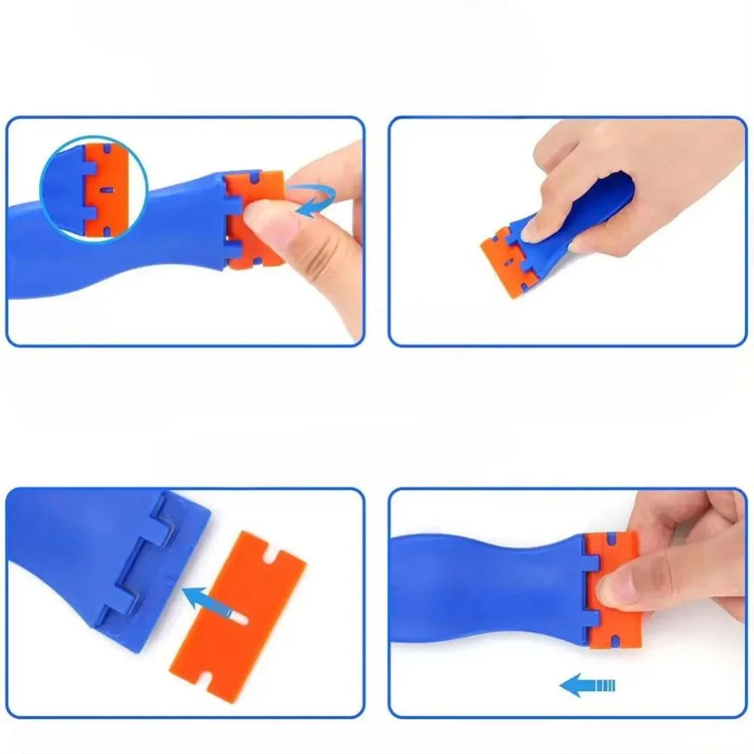 Denne multifunktionelle barberbladsskraber er designet til sikkert at fjerne klæbemiddel, etiketter, rester og snavs fra mange overflader. Den bruger holdbare plastblade i stedet for metal, så du får stærk rengøringskraft uden skader. Den er kompakt, nem at holde og nem at vedligeholde og er perfekt til rengøring af hjem, bil, køkken og badeværelse.