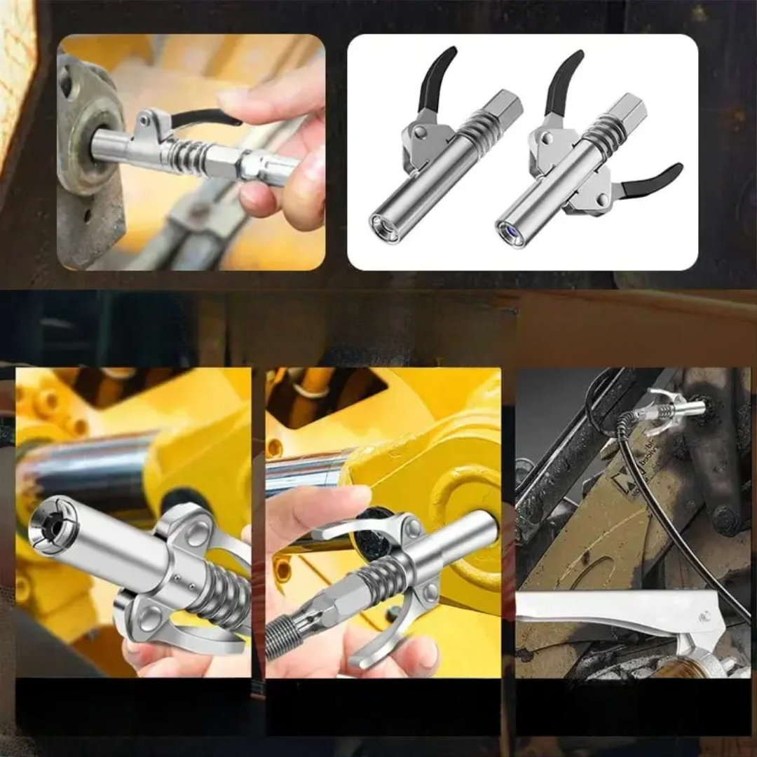 Denne opgraderede fedtkobling er bygget til både kraft og præcision og er lavet af holdbart rustfrit stål og har en silikoneolietætning i rumfartskvalitet, der giver lækagefri ydelse under højt tryk. Dens dobbelte håndtag og skridsikre greb gør smøring nemmere, hurtigere og sikrere – selv på trange steder.