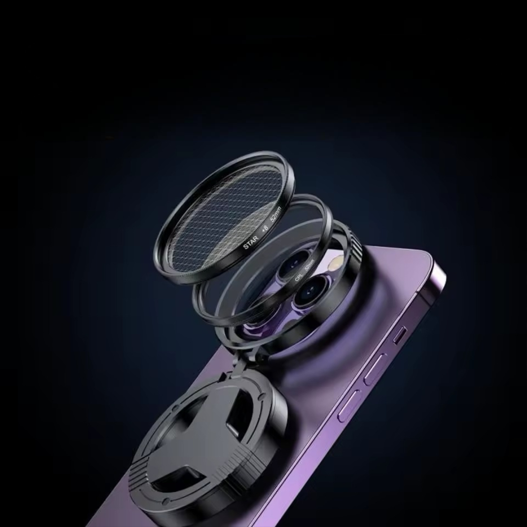 This 2-in-1 magnetic CPL and star filter lens helps you shoot like a pro using just your smartphone. The CPL filter reduces glare and reflections for sharper, richer colors, while the star filter turns point-light sources into beautiful starbursts — perfect for night scenes, sunsets, and city lights. With its foldable magnetic holder, you can shoot hands-free and adjust angles easily for creative photography anywhere.