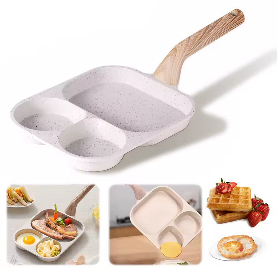 This 3-in-1 non-stick frying pan lets you prepare eggs, steak, pancakes, and vegetables in one pan. Its divided design saves time, keeps flavors separate, and makes everyday cooking faster and cleaner. This frying pan is designed for busy kitchens and small spaces. The non-stick granite coating needs little oil, heats evenly, and wipes clean in seconds. It works on gas and induction stoves, making it perfect for daily breakfasts and quick meals.