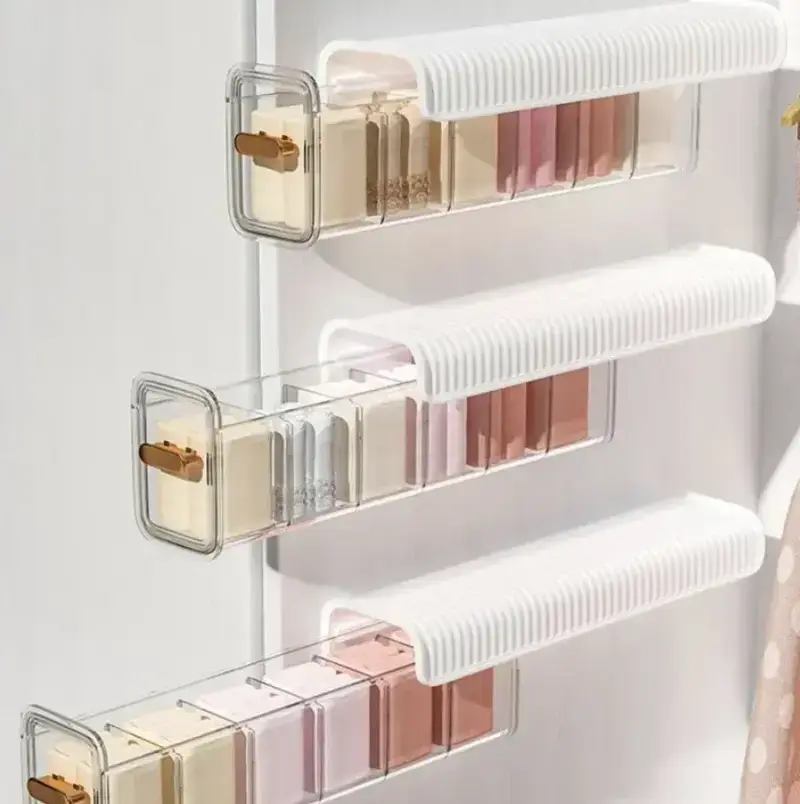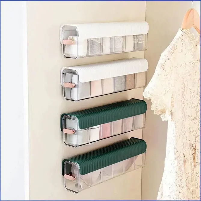 This multifunctional storage box is perfect for keeping your clothes and essentials neat, clean, and easy to find. Its wall-mounted design saves space, while the transparent, dustproof cover keeps everything tidy and visible. With adjustable compartments and a sleek gold-plated handle, this organizer blends beauty with functionality. Ideal for closets, bathrooms, laundry rooms, or any room that needs order.