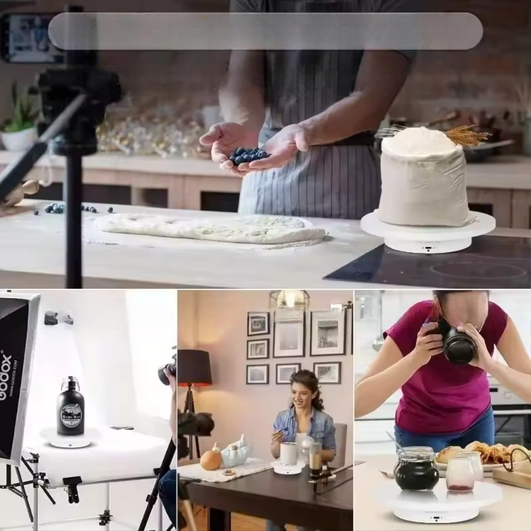 This electric rotating table is perfect for product photography, jewelry display, cake decorating, and more. With adjustable rotation speeds, multiple angles, and a quiet motor, it lets you capture smooth, professional 360° views effortlessly — ideal for photographers, sellers, and creators.