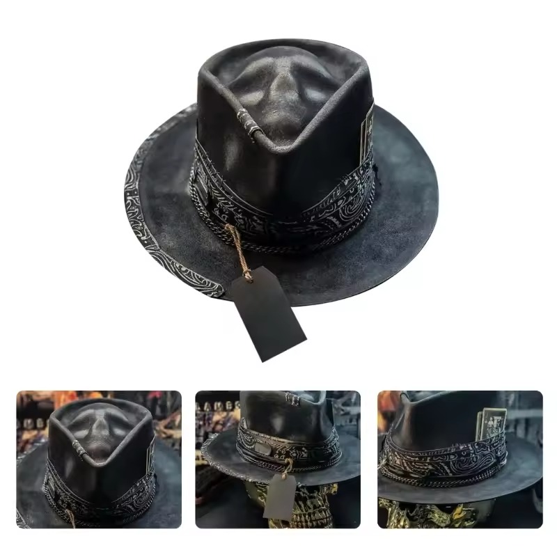 The skull cowboy hat adds a unique and bold touch to any outfit. Its dark color and skull detail make it a standout piece for special occasions or daily wear. Perfect for those who love gothic or western fashion.