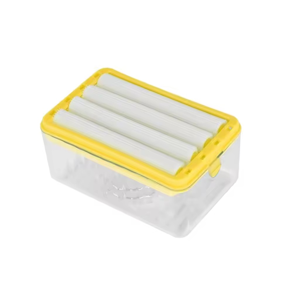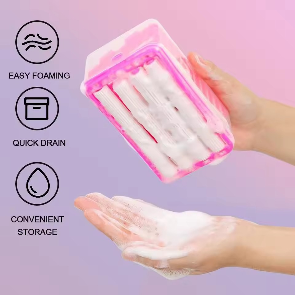 The soap dish box has a simple lid that opens easily. Place the soap between the sponge rollers, and it will create foam quickly. It helps you wash without needing to rub the soap by hand.