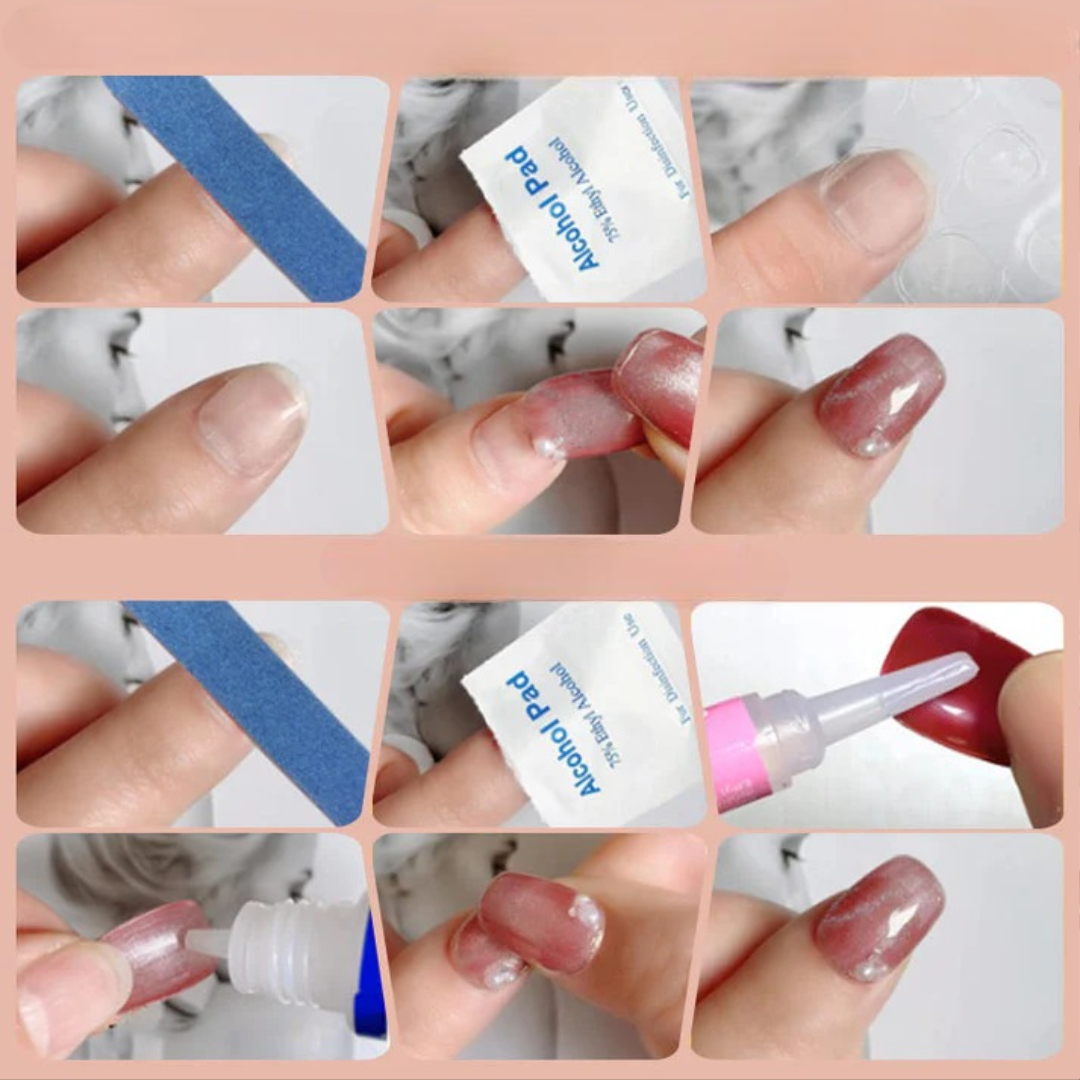 Apply either nail glue (for long wear) or nail gel (for reusable wear).