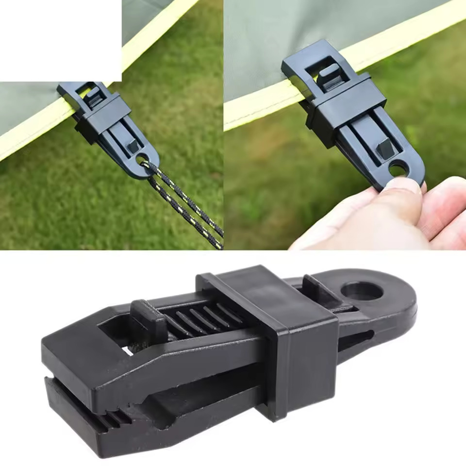These heavy-duty tarp clips are designed with a toothed interface and spiral buckle that lock tightly onto any tarp. Made from durable PP material, they provide strong grip and high load-bearing strength, making them perfect for camping, boating, picnics, or any outdoor setup.