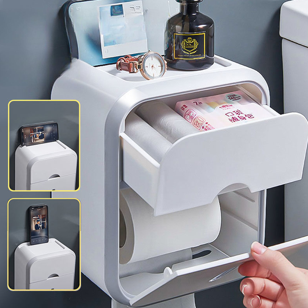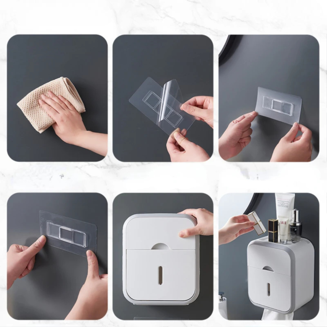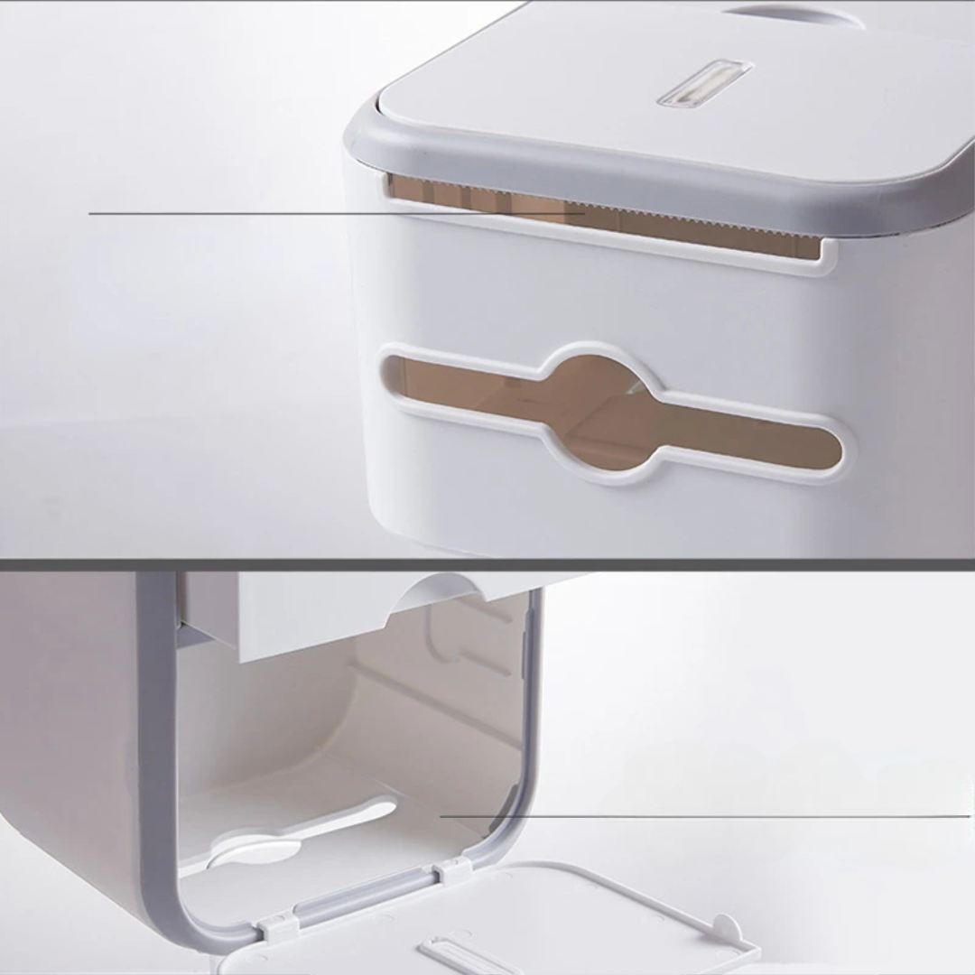 This wall-mounted tissue storage box offers two-layer storage, a clean design, and a punch-free installation method. It keeps tissues dry, stores personal items discreetly, and adds a modern touch to any bathroom or living space. A clean, convenient, and space-saving way to organize your tissues and everyday essentials.