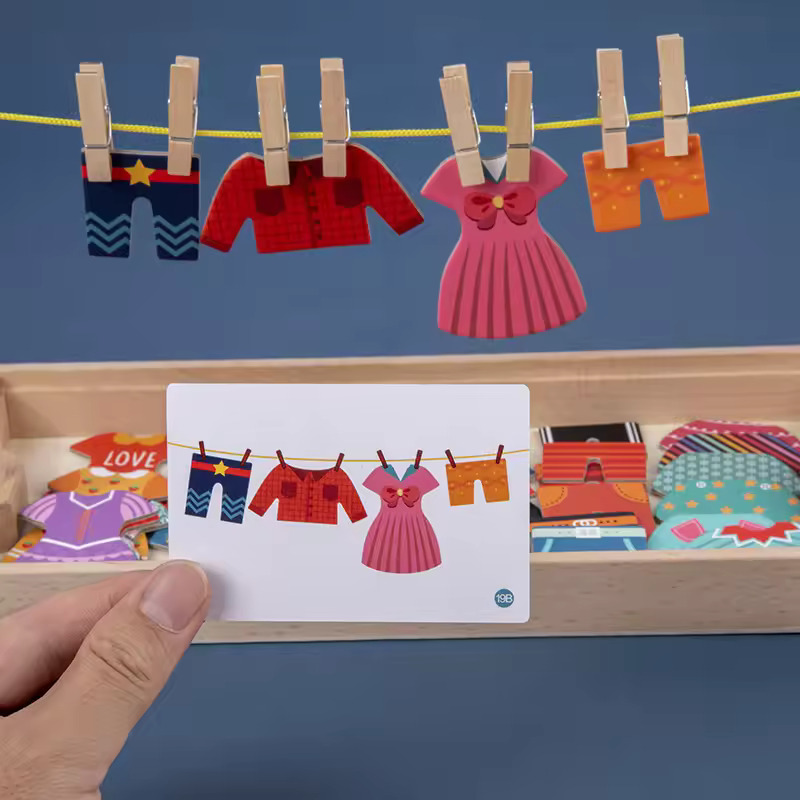 Let your child explore creativity while developing coordination and problem-solving skills! This wooden dress-up puzzle lets kids mix and match magnetic clothing pieces to dress up cute characters in endless outfits.